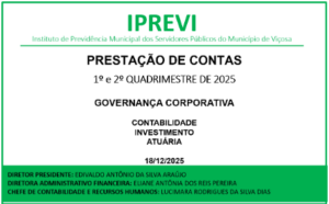 O Instituto de Previdência Municipal dos Servidores Públicos do Município de Viçosa participará nesta quinta-feira de Audiência Pública de Prestação de Contas referente ao 1º e 2º quadrimestres de 2025. Com objetivo de apresentar à população informações detalhadas sobre a aplicação dos recursos públicos, reforçando a transparência e o controle